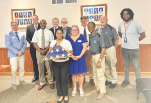 Melari Binet, a new U.S. citizen, holds the United States flag that was presented to her at a recent council meeting by her coworkers at HELP Initiative, Inc. In the photo are Seaford City Manager Charles Anderson, Mayor Matt MacCoy, Council members Orlando Holland, Mike Bradley, Dan Henderson, Stephanie Grassett, Alan Quillen, HELP Initiative Executive Director Charles Kistler, Harold Stafford, and Tyrel Barnes.