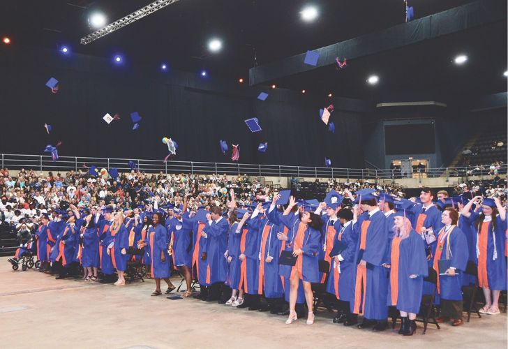The Delmar class of 2023 members throw their caps in the air following the completion of last Thursday’s commencement at the Wicomico Civic Center. Photo by Mike McClure