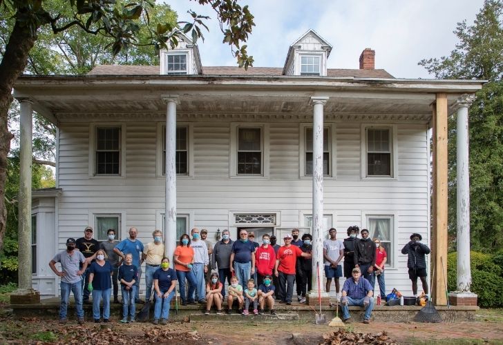 Volunteers gather on the front porch of Rosemont after a day of work cleaning up the grounds. Photo by Paula Shannon