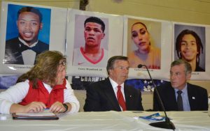 Oversized photos of the young people who have been killed by gun violence were posted on the wall of the gymnasium behind Governor Carney and other community leaders invited to be a part of the town meeting. Danielle Stevens, mother of Kylee Robinson, said seeing the photo of her son on the wall was difficult for her at first.