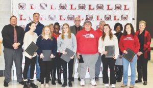 Shown with Laurel School Board members and administrators are Laurel seniors and future educators Brianna White, Amber Anderson, Gala Meseguer Molina, Cody Donoway, Sidney Hastings, and Lucy Rawlings who were each presented with a promise of employment contract for the 2027 school year during December school board meeting. The offers are redeemable following the students’ graduation from college. Not pictured is senior Wilvenska Mouche.