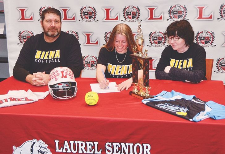 Laurel senior Carlie Venables is shown with parents Scott and Karen Venables during her college signing last week at Laurel High School. Venables will attend Siena College where she will study health science and play softball. Photo by Mike McClure
