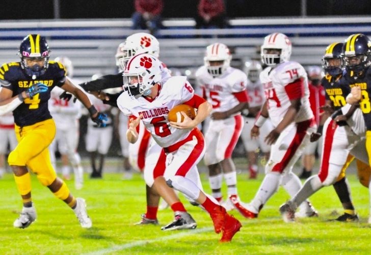 Quarterback Kaden Shockley led the Bulldogs to a 28-0 win over Seaford last Friday night at Bob Dowd Stadium. Photo by Lynn Schofer