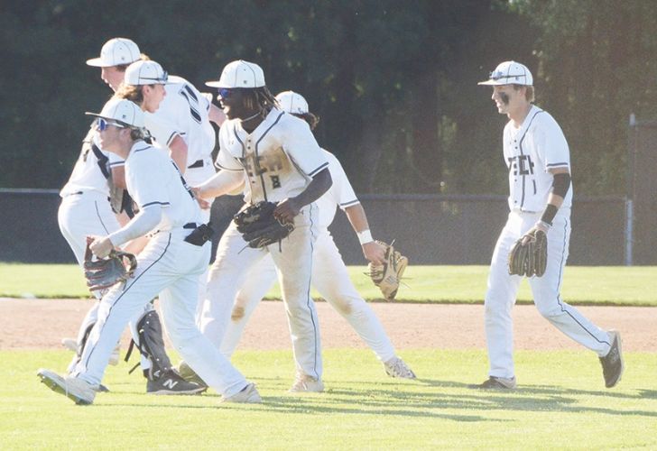 The Sussex Tech baseball players celebrate their team’s 2-0 state quarterfinal win over William Penn on Tuesday. Photo by Mike McClure