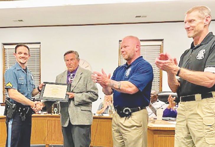 POLICE PROMOTION- Laurel Police officer Daniel Howard was recently promoted to the rank of Corporal. A special ceremony marking the achievement was held during the Monday, Oct. 17 meeting of Laurel Mayor and Council. Pictured here (left to right): Howard is presented a certificate by Laurel Mayor John Shwed as Chief Dan Wright and Capt. Rob Kracyla look on. Photo by Jamie Smith