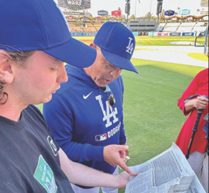 Delmar High School and Temple graduate Samuel O’Neal, left, is shown with Los Angeles Dodgers manager Dave Roberts earlier this month in California. O’Neal and his professor hand-delivered papers to students at Palisades Charter High School, which was damaged in wildfires at the beginning of the year.