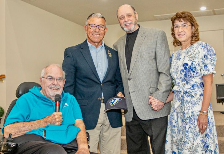 Seaford High School 1977 graduate Fred Abbott was given a Blue Jay hat on his recent visit to Seaford. In the photo with Fred Abbott is his wife Vickey as well as his high school track coach John Hollis and Seaford Fire Department chaplain, school board member, community volunteer, and friend Amore Rice, Jr. Photo by Paula Shannon