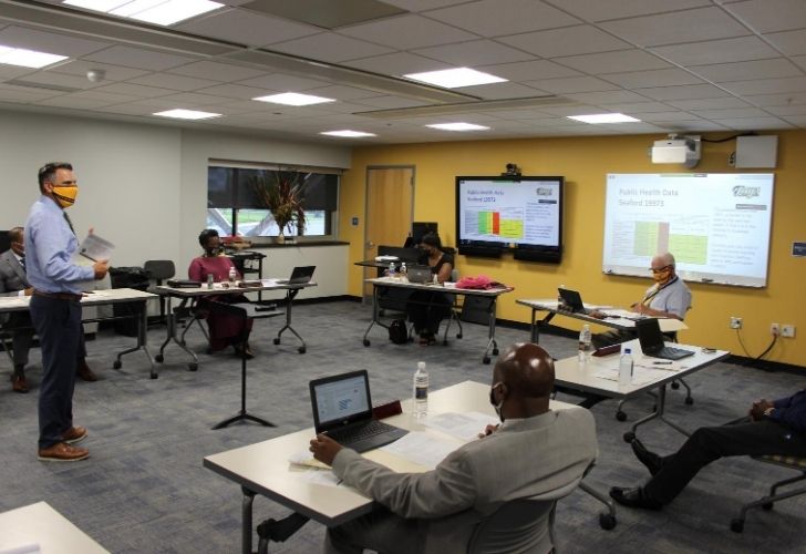 Seaford Superintendent Dr. Corey Miklus, standing, presents the district’s school reopening plan during the school board meeting on Monday, Aug. 17. The board voted, 5-0, to approve the hybrid/remote learning plan. You can go to the district’s website at www.seafordbluejays.org for further reopening information or contact your school. Photo by Scott Bleile