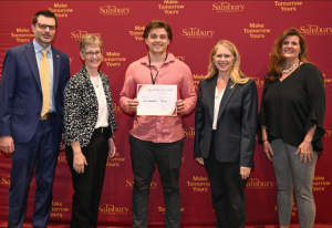 Pictured, from left: Michael Jensen, SU executive director of entrepreneurship; Carlene Cassidy, Ratcliffe Foundation CEO; Jake Henry; SU President Carolyn Ringer Lepre; and Dr. Christy Weer, dean of SU’s Franklin P. Perdue School of Business.