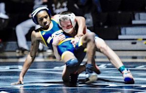 Sussex Tech gained the opening six points forfeiture and went on to score 66 points on 11 pins. Sussex Tech’s Parker Hampton and Don Lemay of Seaford worked the mat in the first period with Hampton scoring on a takedown and two nearfalls for a 7-0 lead. Lemay fought off the takedown attempts in the second period until Hampton made a move that pinned Lemay at 3:45 for the win. In the 120 pound weight class Drake Rogers defeated Julian Lopez by technical fall, scoring 15 points in the first period. Rogers took Adkins to the mat for three four point nearfall scores.