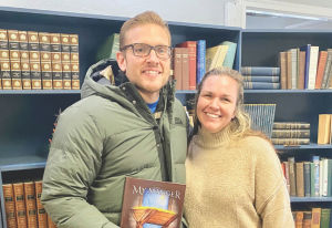 Husband and wife TJ Dukes and Rachel Dukes, owners of Dukes Films, are shown in front of the book case they purchased on Wayfair and put together for the film “My Manger” which they filmed at Gallery 107 in Seaford. Books were borrowed from Rachel’s grandfather for the film, set in a book store. TJ wrote and directed the short film.