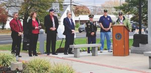 Representative Danny Short speaks of the improvements made to the Memorial in Kiwanis Park at the Veterans Day Ceremony. Shown are (left to right) City Manager Charles Anderson, Director of Economic Development Trisha Newcomer, Seaford Mayor Matt MacCoy, State Senator Bryant Richardson, Armore Rice, and County Council President Mike Vincent. Photo by Lynn Schofer