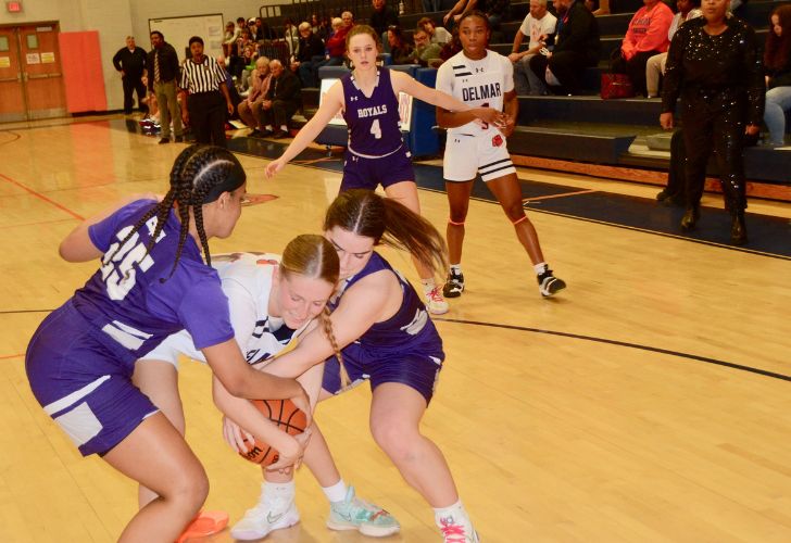 The Delmar varsity girls’ basketball team rallied to move within nine points of Delmarva Christian at half-time of last Friday’s home contest after trailing, 12-0, in the first quarter. The Royals led by 23 after three quarters of play and went on to win, 44-24.