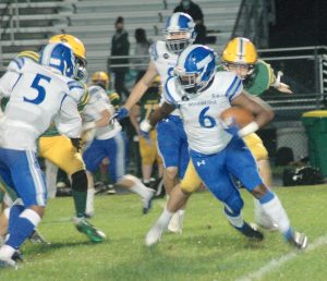 Woodbridge’s Kenny Newton looks for room to run in his team’s 36-3 road win over Indian River last Friday night. Newton ran for two two-point conversions in the victory. Photo by Mike McClure