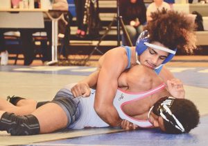 Woodbridge freshman Jayven Chapman, top, held a 10-5 lead before recording a pin with 59 seconds left in the second period of his 138 pound match last weekend. Photo by Mike McClure